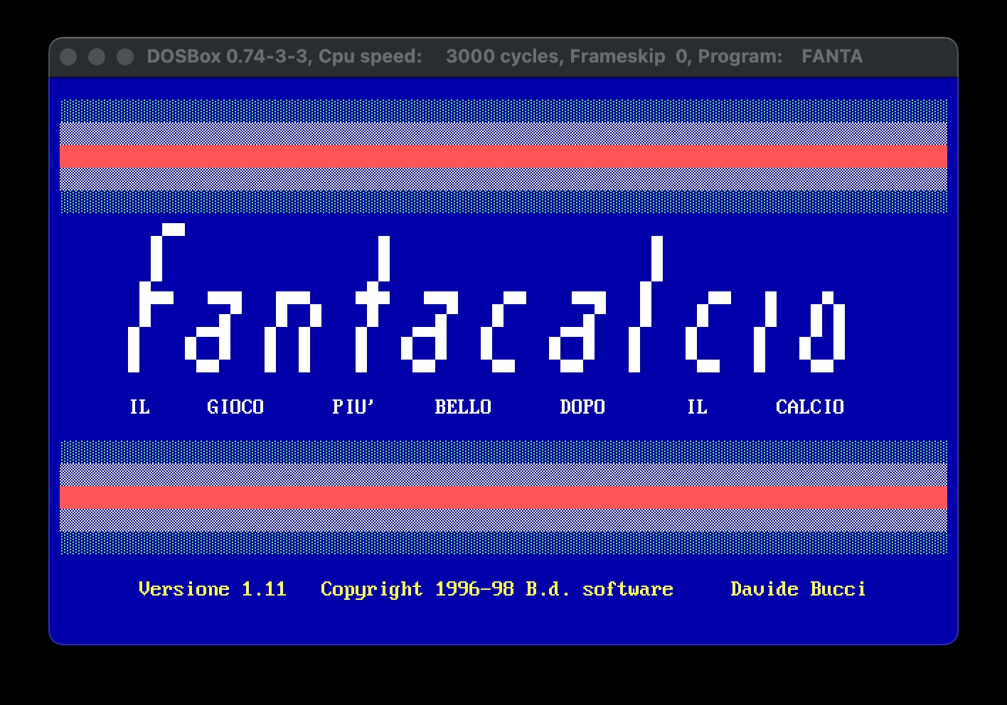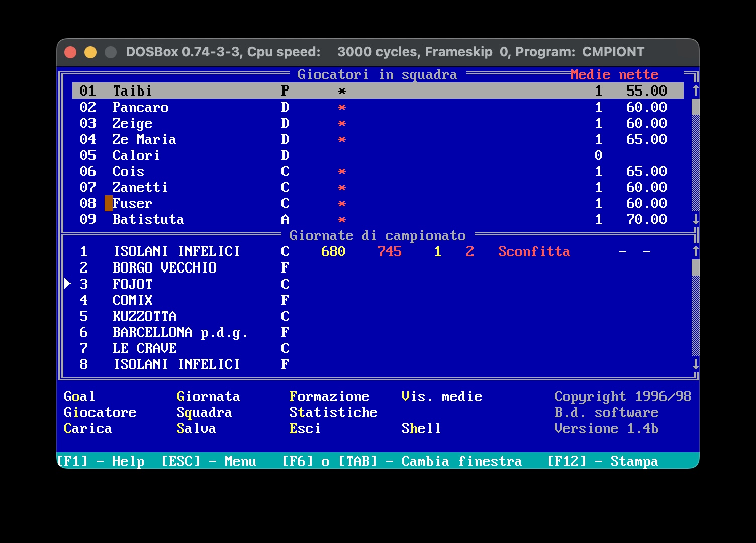 Fantacalcio 1.4 per DOSAn Italian fantasy football management program, written in Visual Basic for DOS and in assembly language. It was tailored to work properly on an Olivetti M200 of a friend of mine, so it requires little memory and computing power. I built the text user interface from scratch and that was most of the work. The mouse is not entirely supported, but the program can be fully used with the keyboard. The source code exploits a neat trick to include small assembly routines in basic strings that are then executed. I used a tool by Francesco Balena that used the DEBUG command to compile the source code and generated the strings to be included in the programs. At the time, I really liked this hack! |